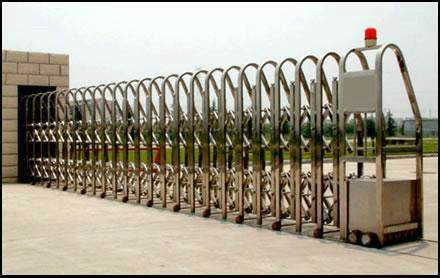 石家莊伸縮門(Retractable door),就是門體可以伸縮自由移動,來控制門洞大小、來控制行人或車輛的攔截和放行的一種門。伸縮門主要由門體、驅動電機,滑道、控制系統構成。 門體采用優質不銹鋼及鋁合金專用型材制作,采用平行四邊形原理鉸接,伸縮靈活行程大。驅動器采用特種電機驅動,蝸桿蝸輪減速,并設有自動離合或手動離合器,自動離合停電時可自動啟閉,手動離合停電時可手動啟閉,控制系統有控制板,按鈕開關,另可根據需求配備無線遙控裝置。可配備滾動顯示屏,顯示300-500字的顯示內容。還可配備智能紅外線探頭防碰撞裝置,遇人或異物20-30CM可自動返回運行,從而保障車輛及行人的安全。
